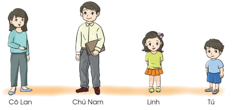 Quan sát tranh, xác định các đường vạch ngang ở phía chân và phía đầu mỗi người, từ đó so sánh rồi chỉ ra ai cao nhất, ai thấp nhất.