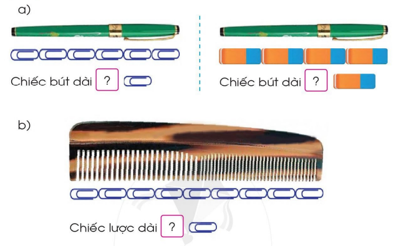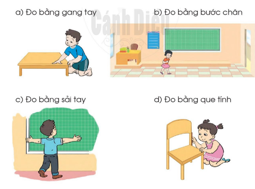 c) Bảng lớp dài khoảng 3 sải tay. d) Chiếc ghế cao khoảng 8 que tính.