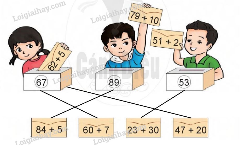 Thực hiện các phép tính ghi trên bảng gỗ rồi nối kết quả của chúng với kết quả được ghi trên từng chiếc hộp.
