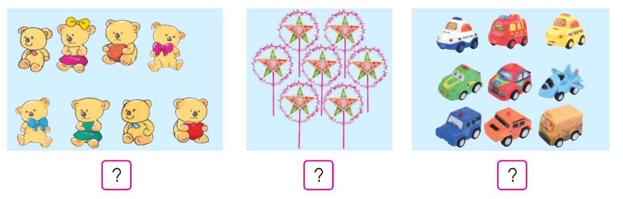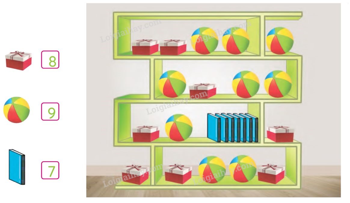 Đếm số đồ vật mỗi loại trong bức tranh và điền số thích hợp.