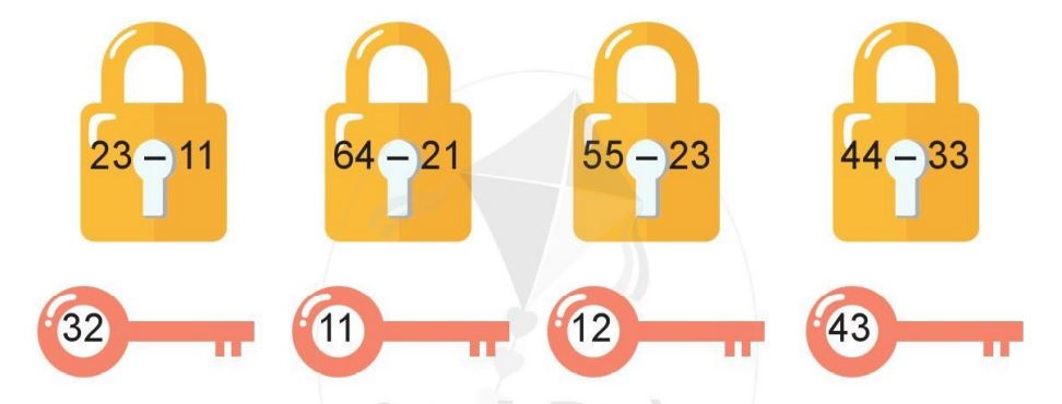 Thực hiện các phép tính được ghi trên mỗi ổ khóa rồi nối với kết quả với được ghi trên mỗi chiếc chìa khóa.