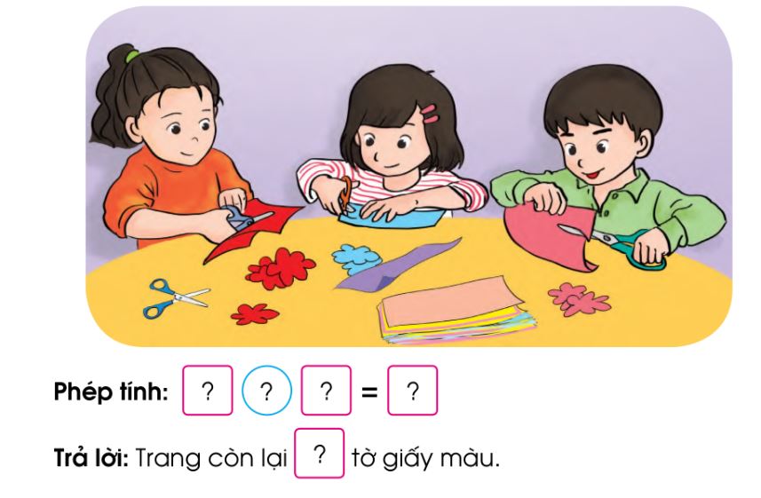 Số tờ giấy màu còn lại = Số tờ giấy màu ban đầu – Số tờ giấy màu dùng để cắt hoa.
