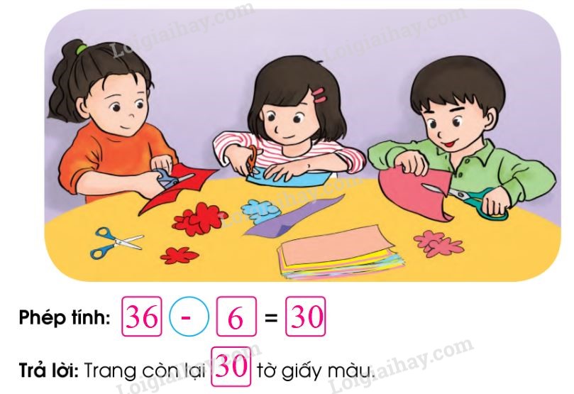 Trang có 36 tờ giấy màu. Trang cắt hoa hết 6 tờ. Hỏi Trang còn lại bao nhiêu tờ giấy màu?