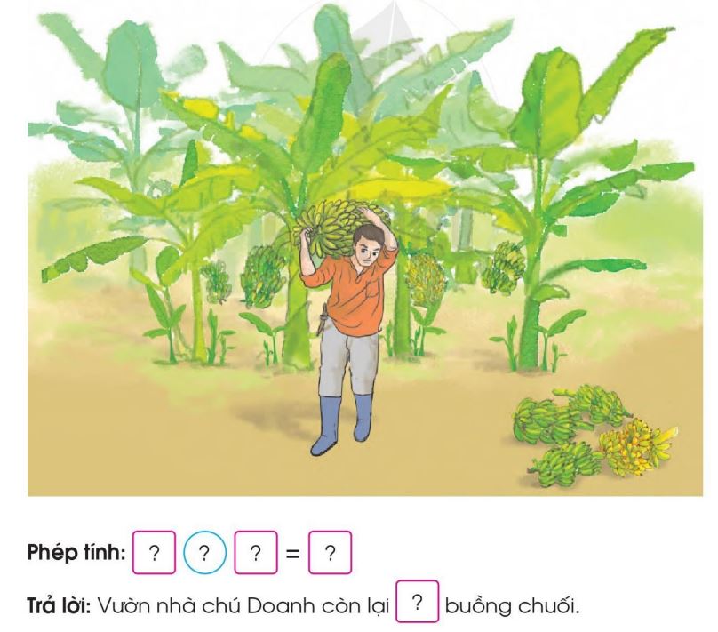 Muốn tính số buồng chuối còn lại ta lấy số buồng chuối ban đầu có được trừ đi 5 buồng chuối chú Doanh đã cắt.