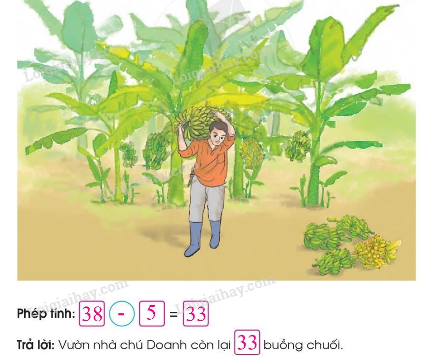 Vườn nhà chú Doanh có 38 buồng chuối, chú đã cắt 5 buồng. Hỏi vườn nhà chú Doanh còn lại bao nhiêu buồng chuối?