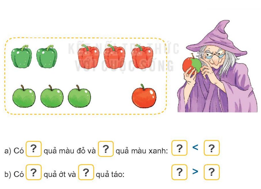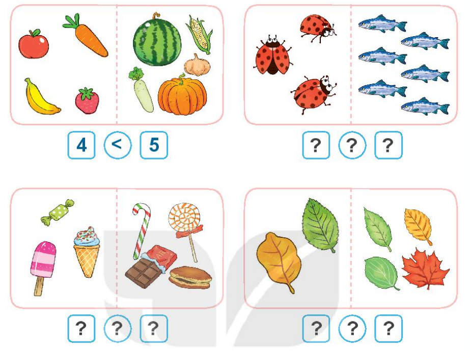 Đếm số vật trong mỗi hình vẽ sau đó điền số và dấu để được phép so sánh đúng.