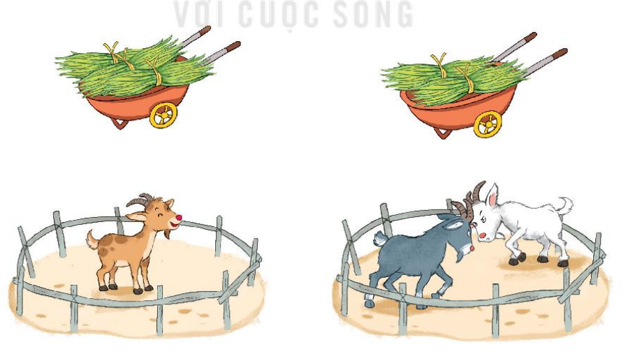 Đếm số bó cỏ và số dê có trong hình sau đó so sánh để chọn xe cỏ thích hợp cho mỗi chuồng dê.