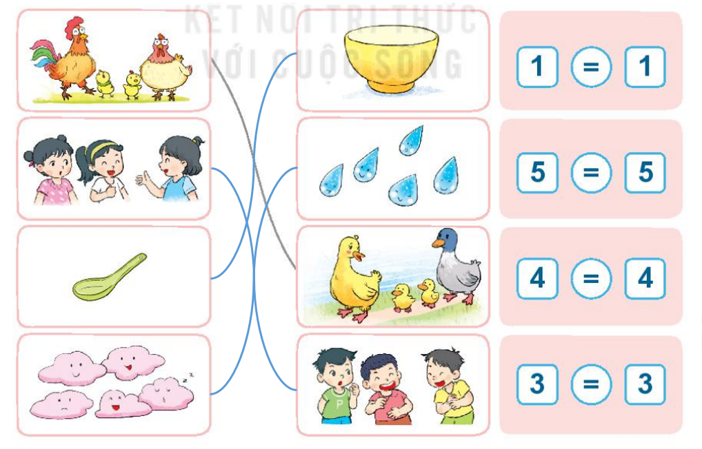 Nối hai hình vẽ có số lượng người hoặc vật bằng nhau.