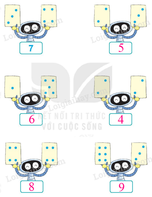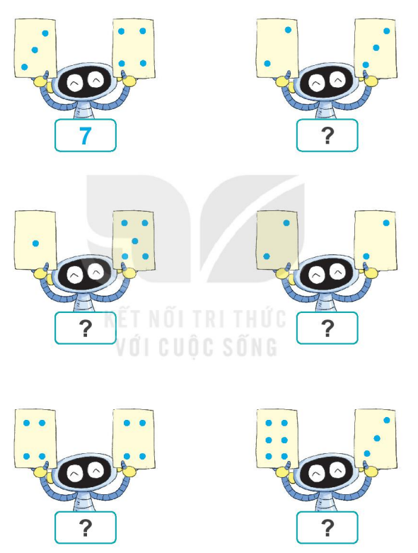 Đếm số lượng chấm tròn có trên cả hai thẻ mà Rô-bốt đang cầm và điền số thích hợp vào ô trống.