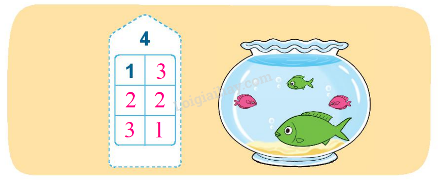 Quan sát mỗi tranh sau đó đếm số lượng chú có trong mỗi bể và đếm số lượng tất cả chú cá có trong hai bể sau đó điền số thích hợp vào ô trống.