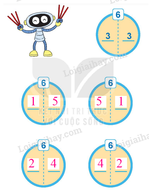 Lấy 6 que tính từ hộp đồ dùng, sau đó chia số que tính thành 2 nhóm và điền các số thích hợp vào ô trống (theo mẫu).