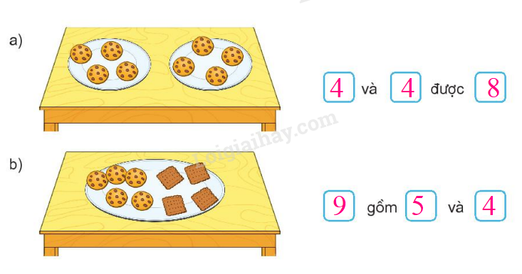 Đếm số cái bánh trên mỗi chiếc đĩa rồi viết số thích hợp vào ô trống.