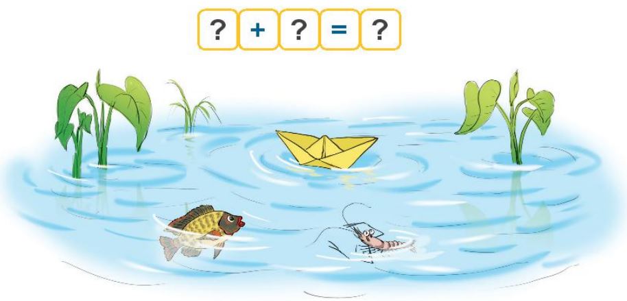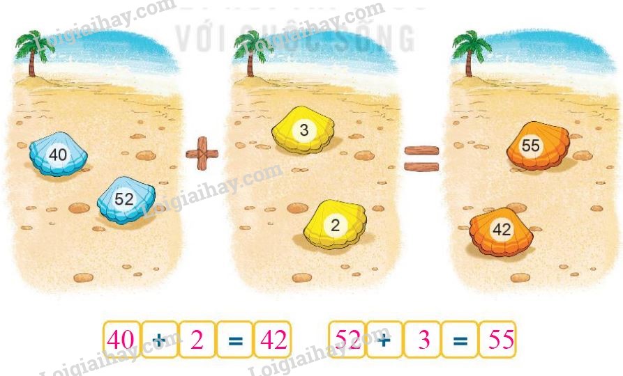 Lấy mỗi số trên vỏ sò màu xanh cộng với một số trên vỏ sò màu vàng để được tìm ra phép tính đúng.
