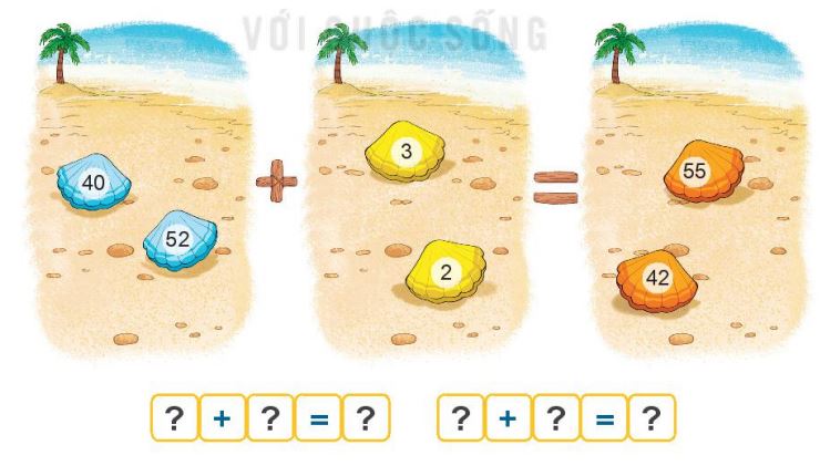 Lấy mỗi số trên vỏ sò màu xanh cộng với một số trên vỏ sò màu vàng để được một số trên vỏ màu cam. Tìm các phép tính đó.