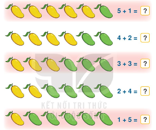 Gộp số xoài màu xanh và số xoài màu vàng ở mỗi câu rồi điền số thích hợp vào ô trống.