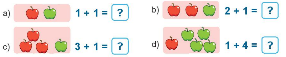 Gộp số táo xanh và táo đỏ có ở mỗi câu, sau đó điền số thích hợp vào ô trống để được phép cộng thích hợp.