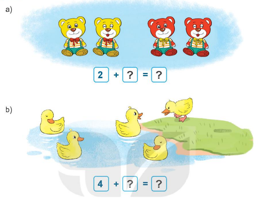 a) Gộp số gấu bông vàng và số gấu bông đỏ có trong hình, sau đó điền số thích hợp vào ô trống.