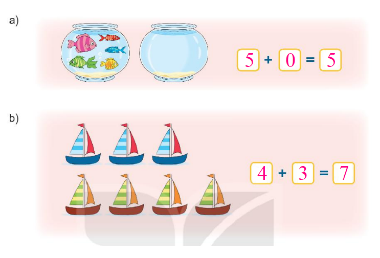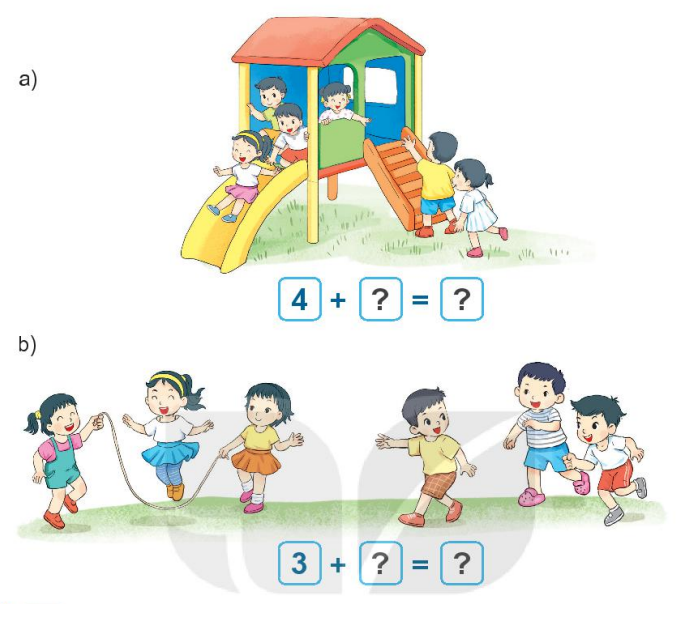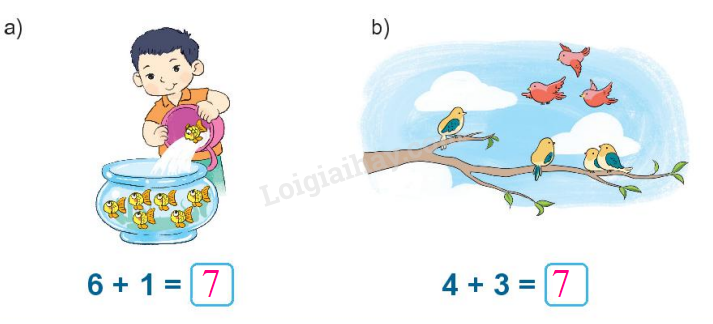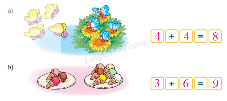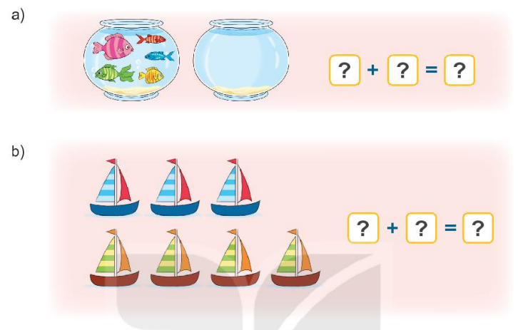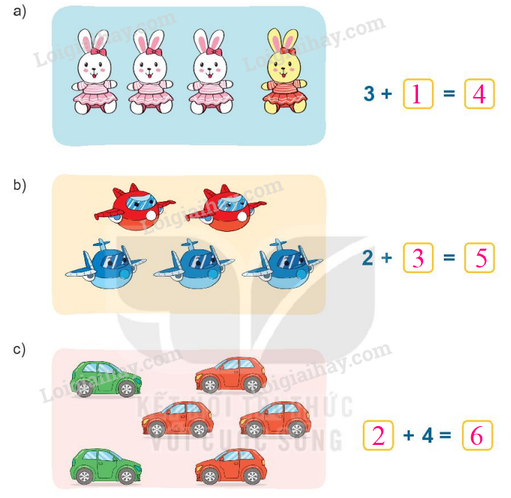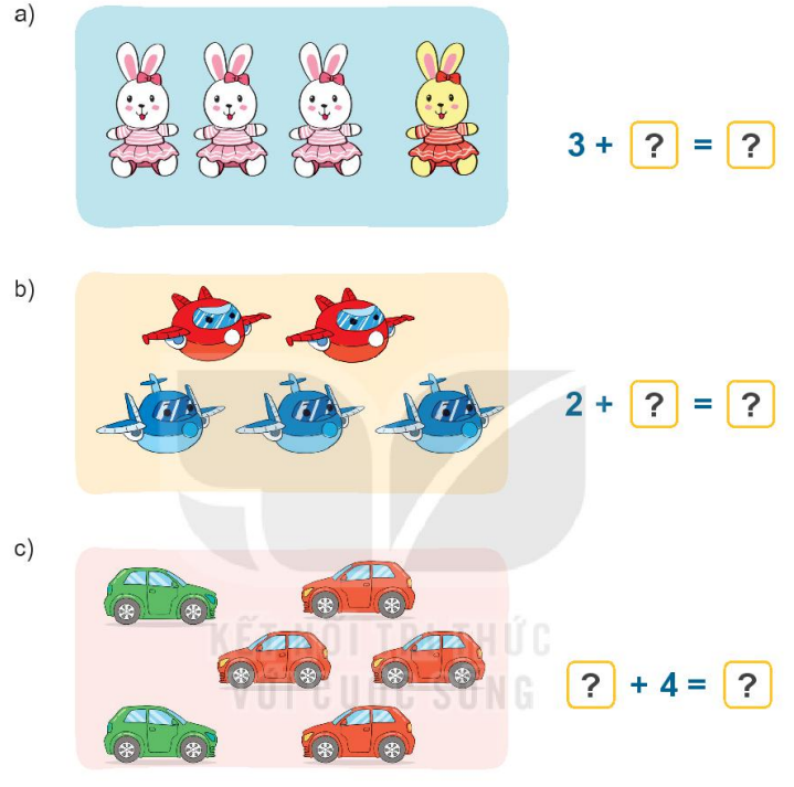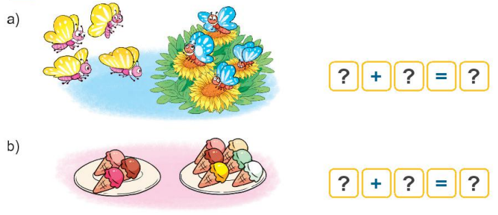 Gộp các vật ở mỗi bức tranh viết các số thích hợp để được phép cộng đúng.