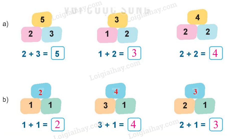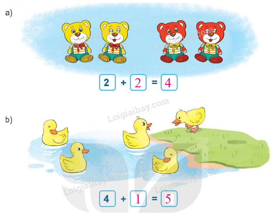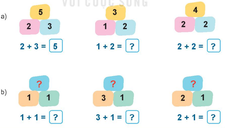 Quan sát tranh rồi viết các phép cộng thích hợp.