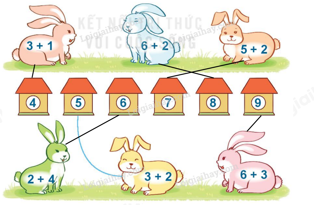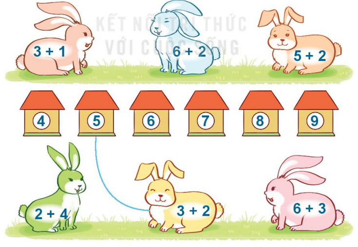 Thực hiện các phép cộng được ghi trên mỗi chú thỏ sau đó tìm chiếc chuồng thích hợp cho chúng.