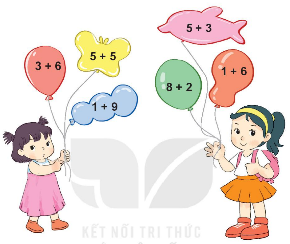 Tính nhẩm kết quả các phép cộng rồi tìm những quả bóng ghi phép tính có kết quả bằng 10.