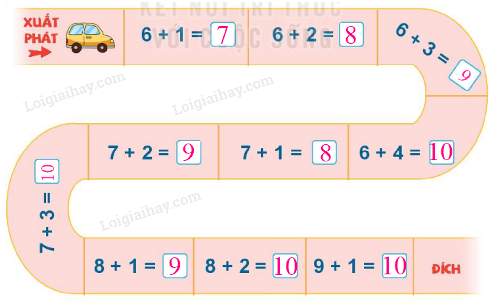 Thực hiện các phép cộng đã cho sau đó điền số thích hợp vào ô trống để giúp ô tô về đích.