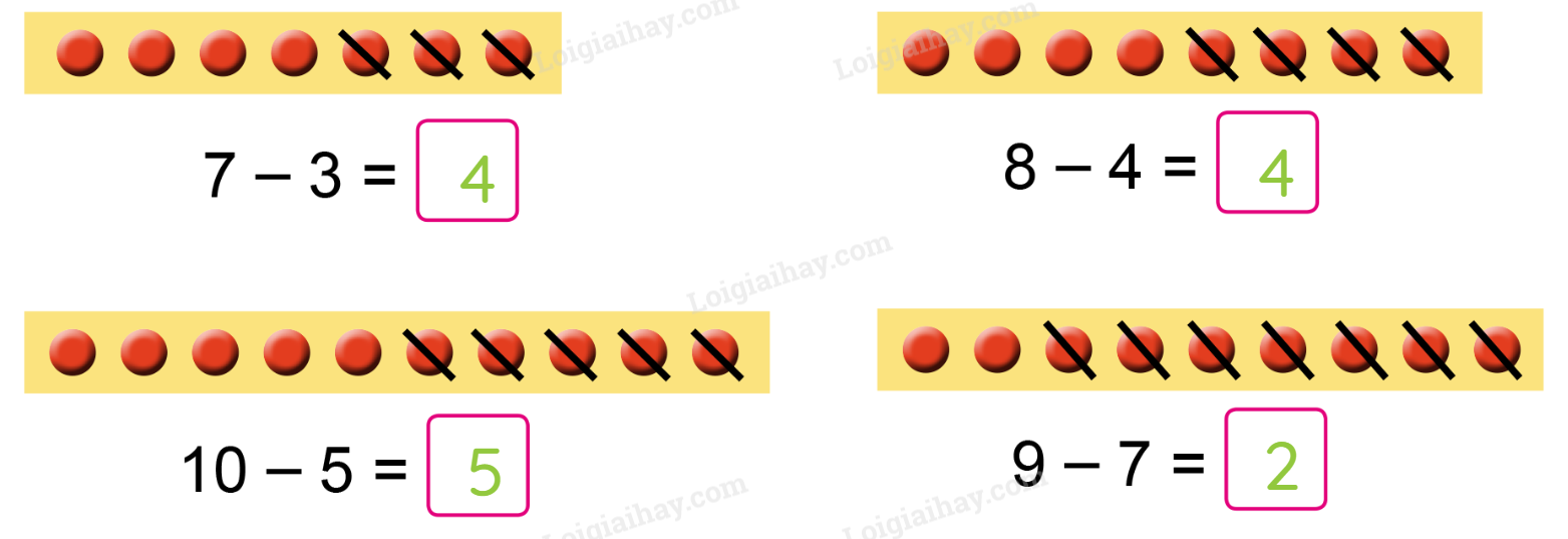 Quan sát tranh, tính nhẩm kết quả mỗi phép trừ rồi điền số thích hợp vào ô trống.