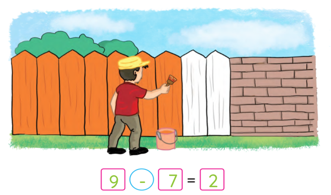 Đếm số tấm gỗ có trong hình và số tấm gỗ đã sơn rồi viết phép trừ thích hợp.