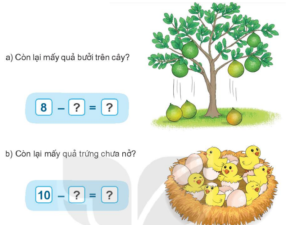 b) Dựa vào bức tranh hoặc tính nhẩm để điền số thích hợp.