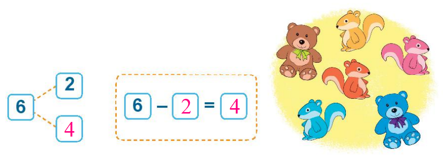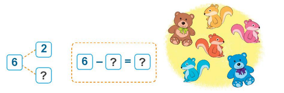 Có 6 gấu bông và sóc bông, trong đó có 2 gấu bông. Hỏi có mấy sóc bông?