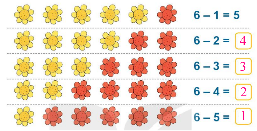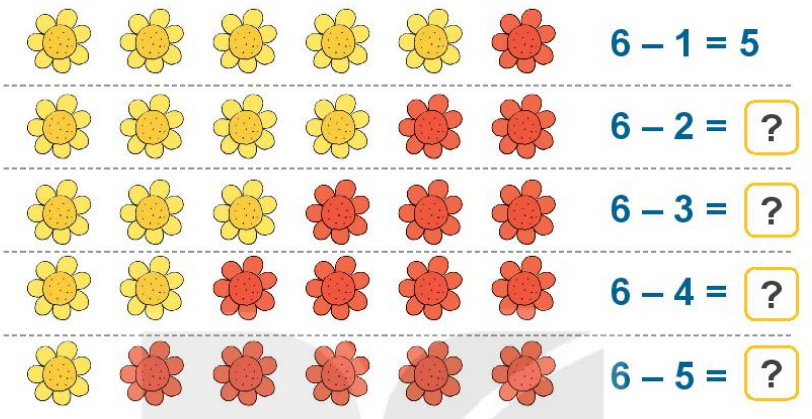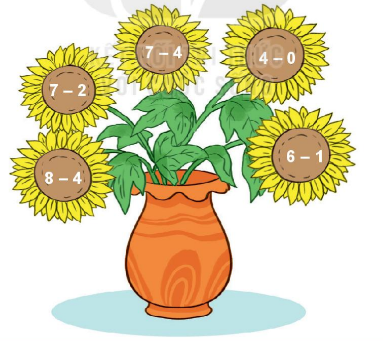 Tính kết quả của mỗi phép trừ để tìm ra bông hoa nào ghi phép tính có kết quả lớn hơn 3.