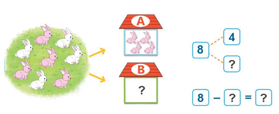Đếm số thỏ trắng rồi điền số thích hợp để được phép trừ đúng.