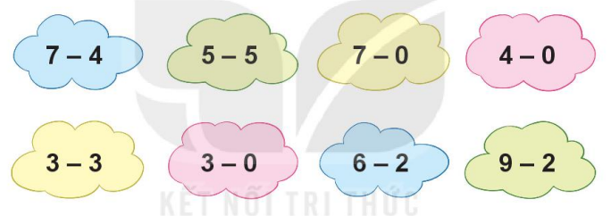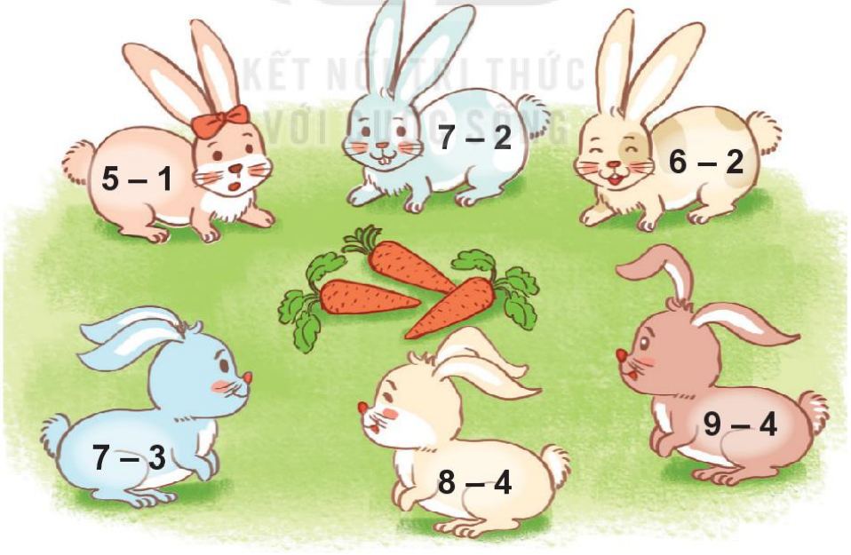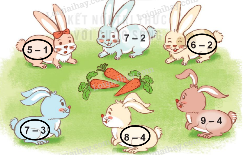 Thực hiện phép trừ sau đó tìm những chú thỏ ghi phép tính có kết quả bằng 4.