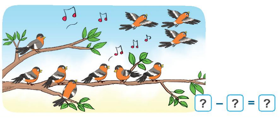 Đếm tất cả số chim có trong hình, số chim bay đi, số chim còn lại trên cành rồi viết phép tính thích hợp.