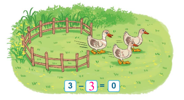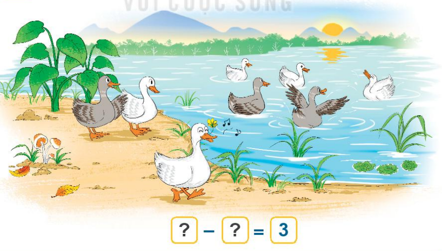 Đếm số con vịt có tất cả và số vịt xuống ao bơi rồi điền số thích hợp.