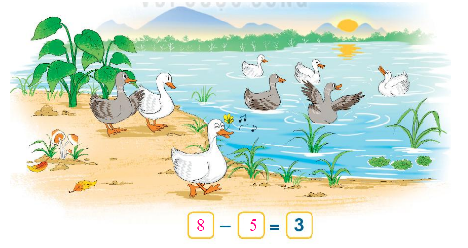 Có tất cả 8 con vịt, 5 con vịt xuống ao bơi. Trên bờ còn lại 3 con vịt.