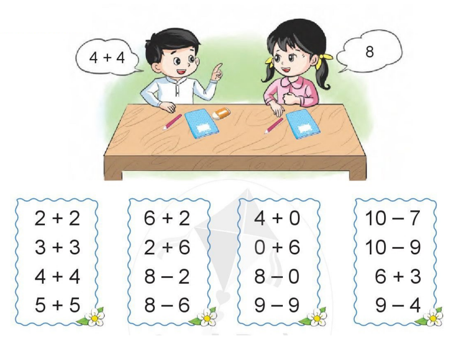 Dựa vào bảng cộng trong phạm vi 8, nêu các phép cộng từ những thẻ số đã cho.