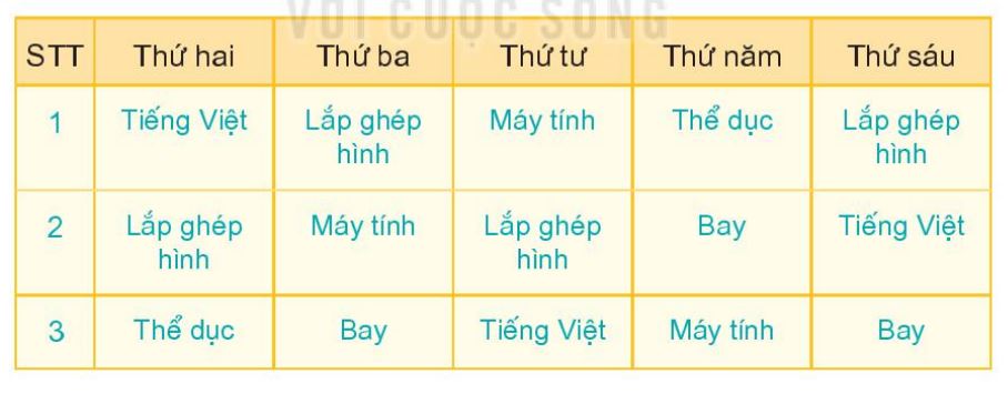 a) Trong ngày thứ Ba rô-bốt học các môn: Lắp ghép hình; Máy tính; Bay.