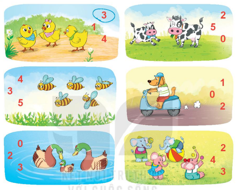 Đếm số con vật trong mỗi tranh rồi khoanh vào số thích hợp.