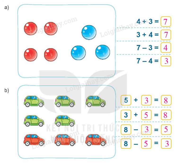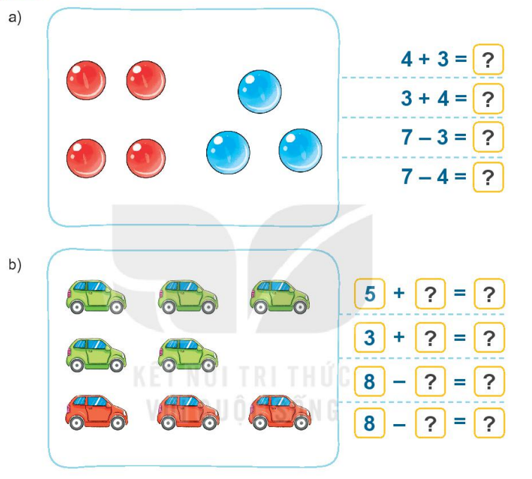 Quan sát tranh, em tính nhẩm rồi điền số thích hợp vào ô trống.