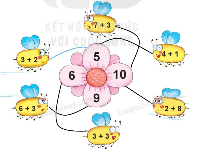 Tính kết quả từng phép tính trên mỗi con ong rồi nối với cánh hoa ghi số tương ứng.