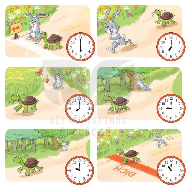 Rùa và thỏ. Em hãy quan sát các bức tranh rồi trả lời.
