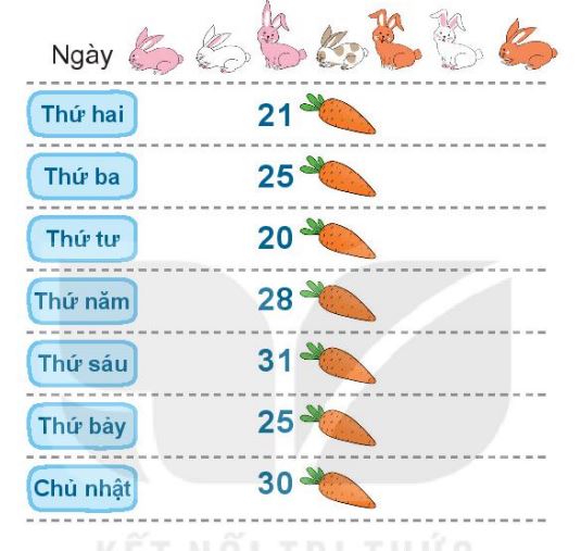 a) Vào ngày thứ Ba và thứ Bảy đàn thỏ ăn số củ cà rốt bằng nhau (cùng ăn 25 củ cà rốt).