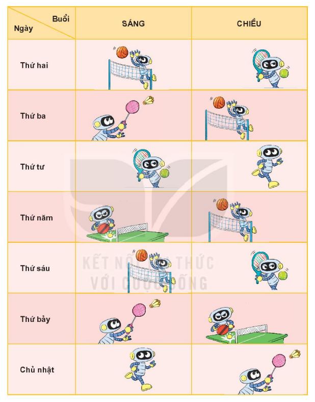 Quan sát lịch chơi thể thao của Rô-bốt để trả lời câu hỏi đề bài.