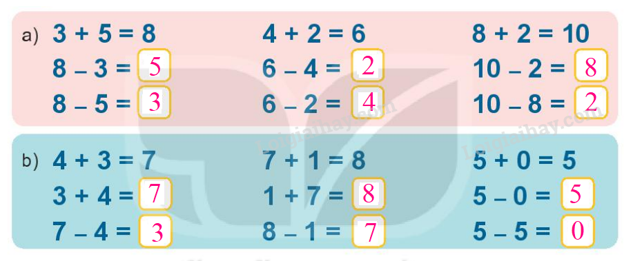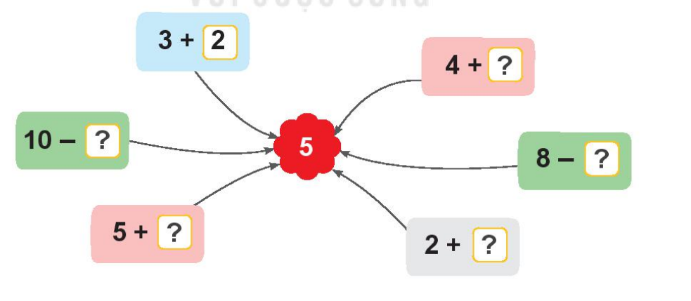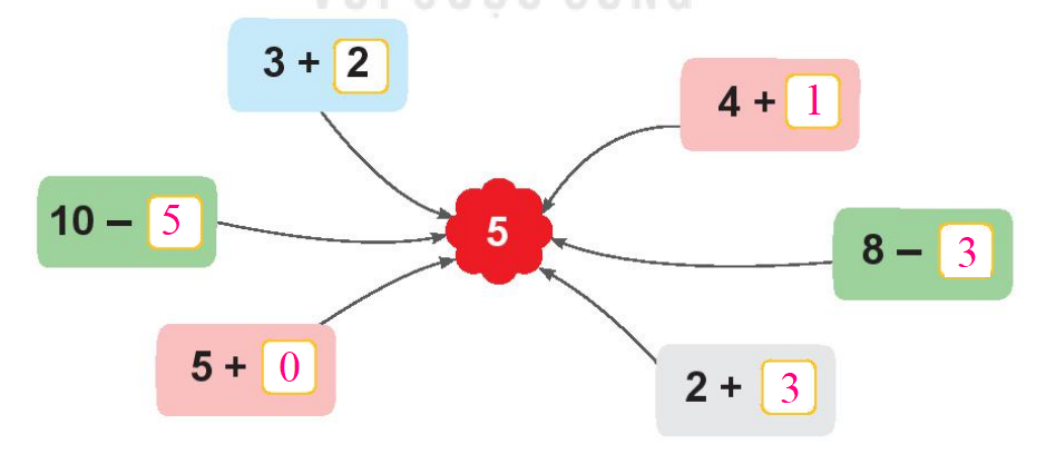 Điền vào ô trống sao cho tổng (hoặc hiệu) của phép tính đó bằng 5.