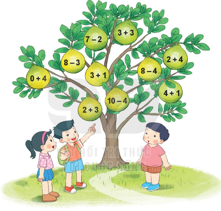 b) Dựa vào câu a để tìm số quả bưởi ghi phép tính có kết quả bằng 5.
