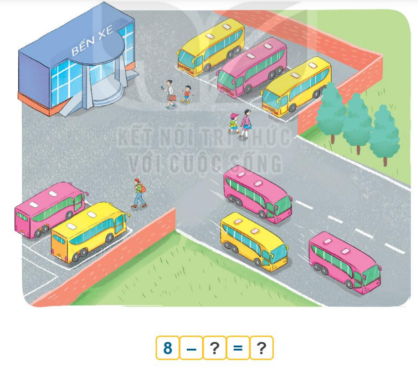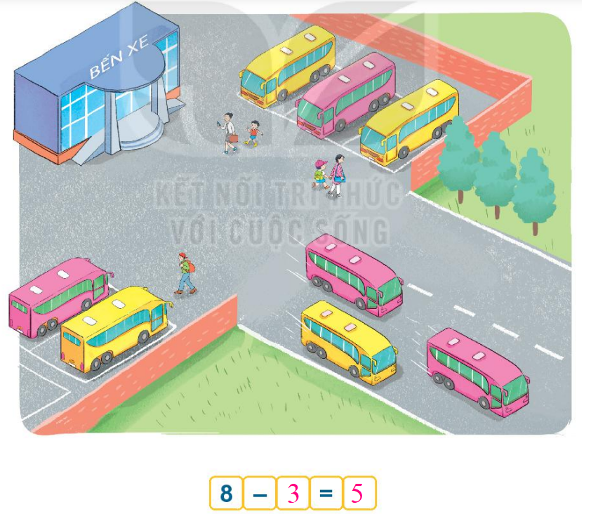Ta thấy bến xe có 8 chiếc ô tô, 3 ô tô rời bến. Vậy ta có phép tính 8 – 3 = 5