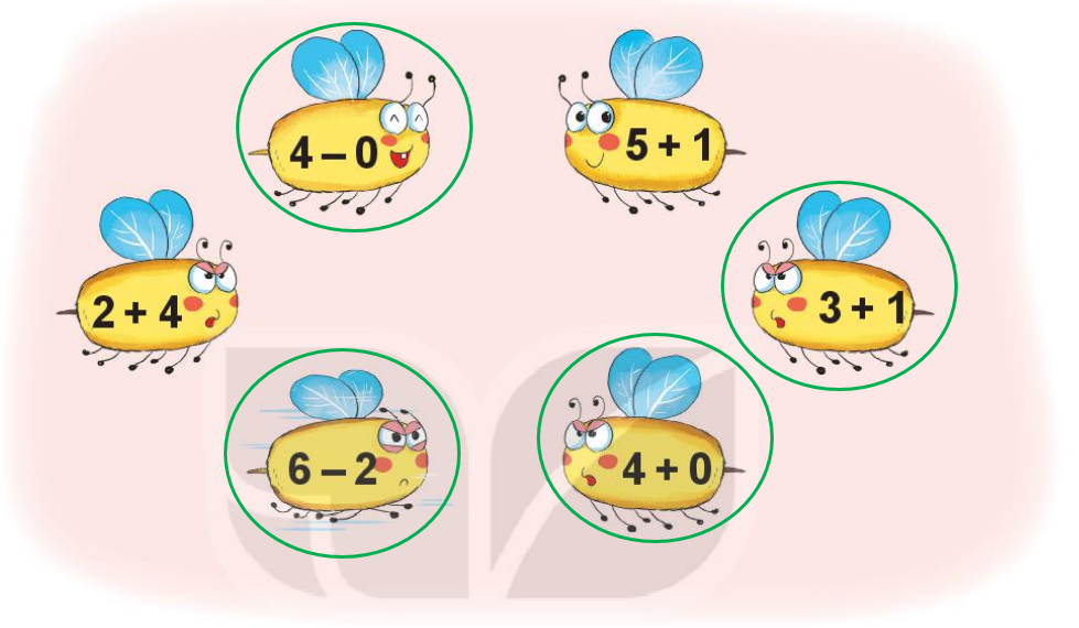 Tính nhẩm kết quả phép tính trên mỗi chú ong rồi kết luận chú ong chứa phép tính có kết quả bằng 4.