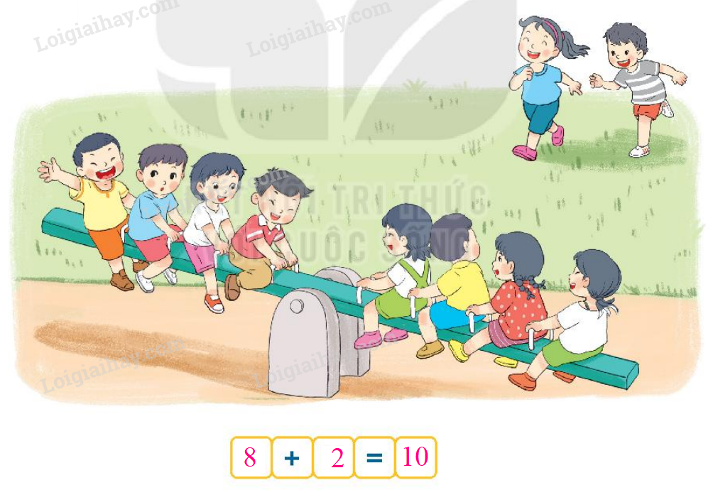 Có 8 bạn đang ngồi trên bập bênh, có 2 bạn khác đang chạy tới.