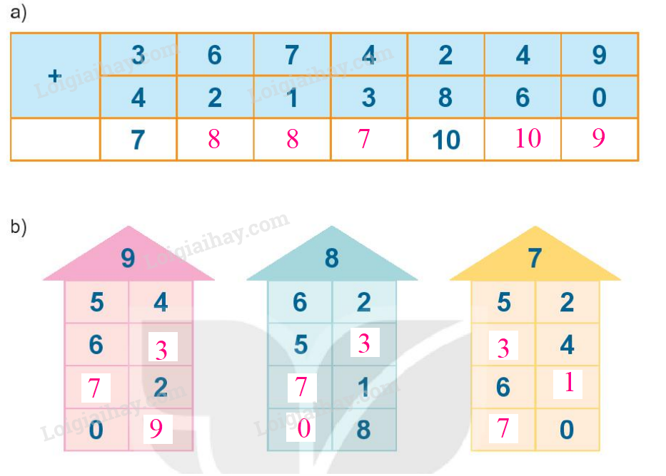 b) Điền số vào ô trống sao cho tổng hai số ở hàng ngang bằng số ghi trên mái nhà.